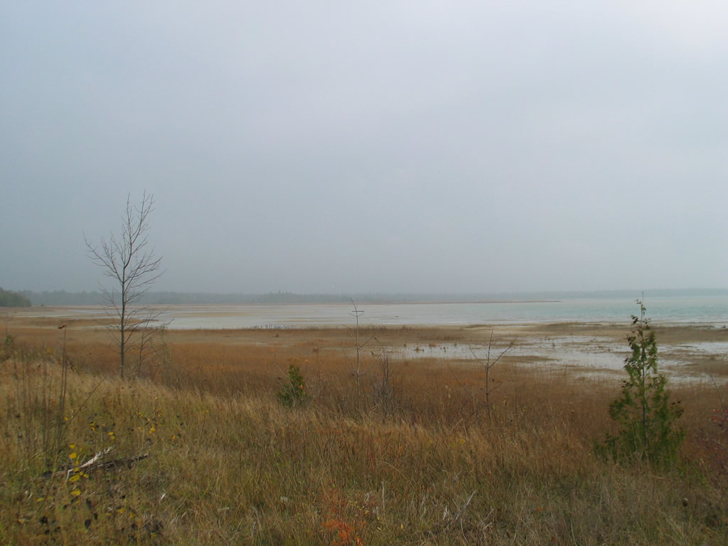 Short steep bank, shallow area near shore, when lake levels are down. The exposed bottom land is several hundred feet from the shore.