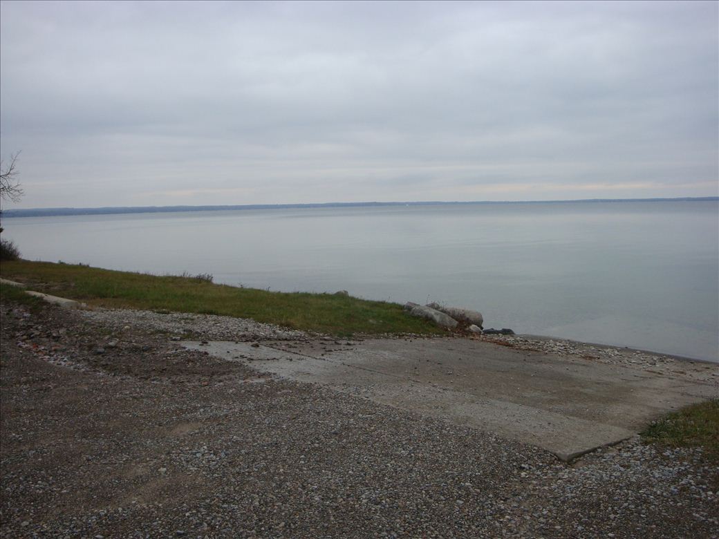 Concrete steep ramp down to shallow sandy bottom. There is a small grassy/rock area to beach.