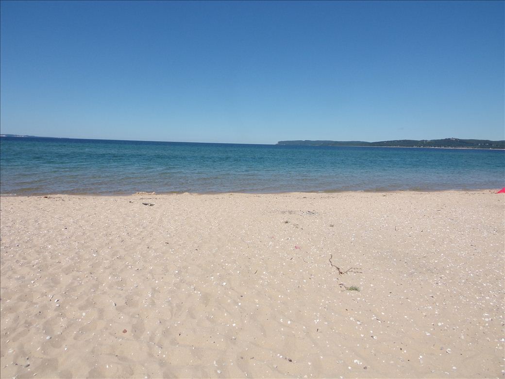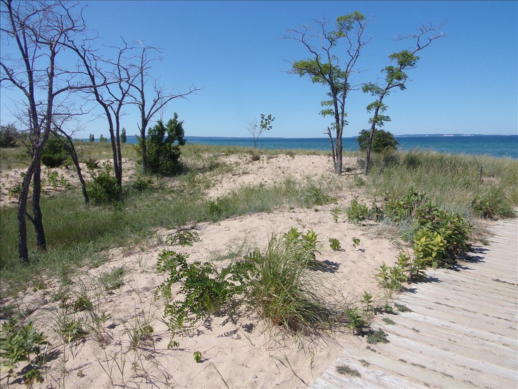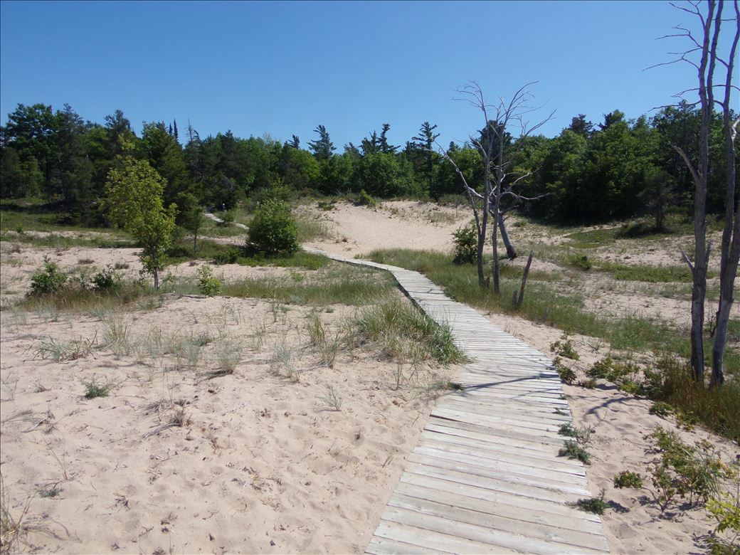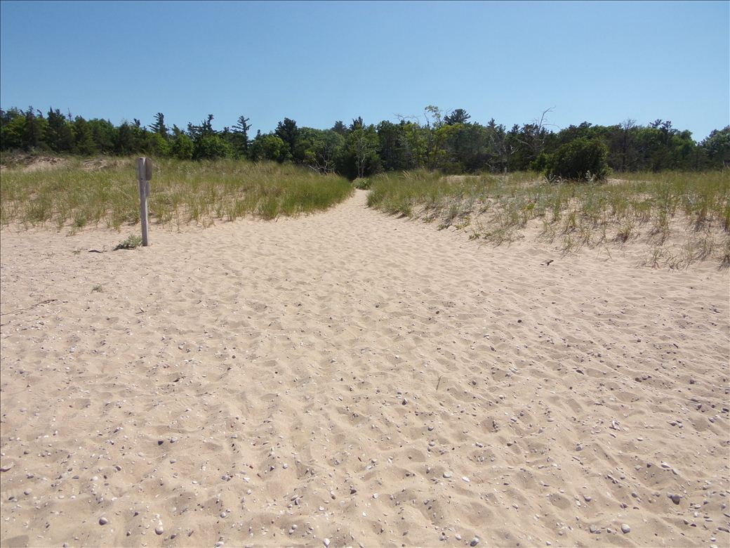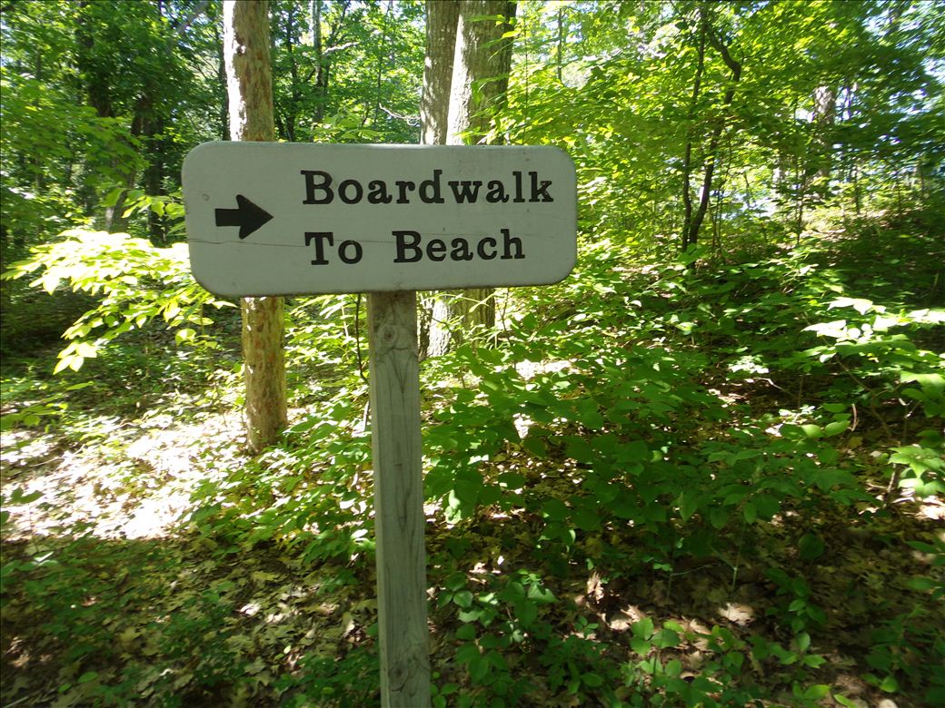 Sandy beach access connected to parking and bathrooms by a boardwalk.