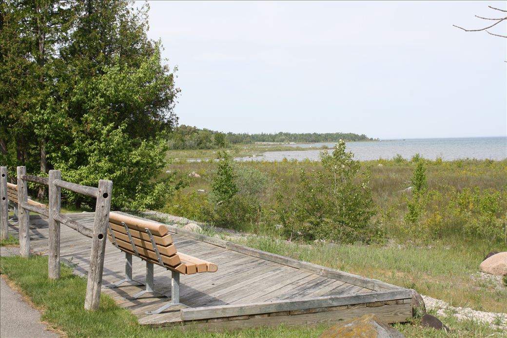Large comfortable park with amenities. Shade and sun picnic areas, water pump, rest rooms, access to bike trail, approximately 1 mile south on 9 Mile Point DNR boat launch