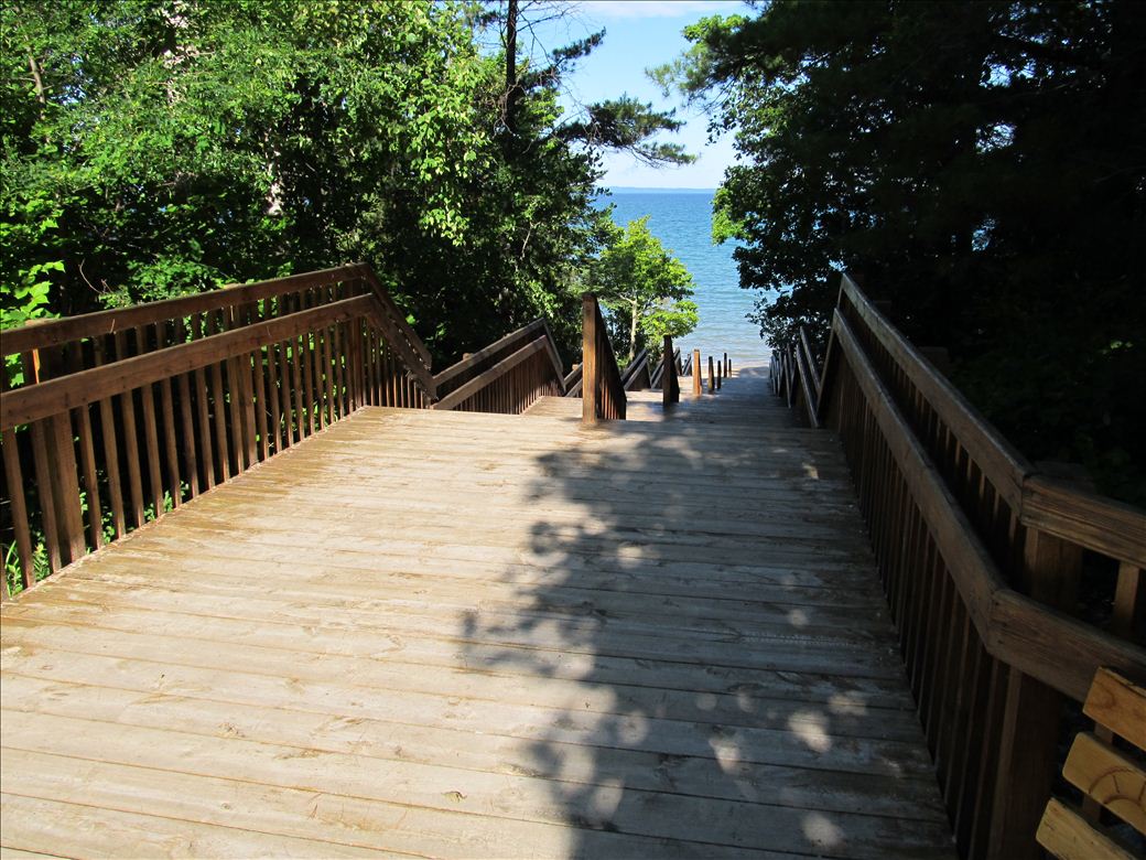 Campground with restrooms and many amenities. There is a dedicated beach parking lot with wide stairs down to the water.