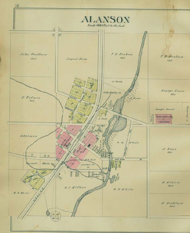 Alanson got its name on June 22, 1882, being named after Alanson Howard, a grandson of W.O. Hugart, president of the G. R. & I. Railroad Company, which first came to Alanson during this time. From Jan. 17, 1877 to June 22, 1882, Alanson was known as Hinman. Alanson got its first Post Office on Jan. 17, 1877, with Hollis Frayer as its first postmaster. Homesteaders began settling here in 1875.