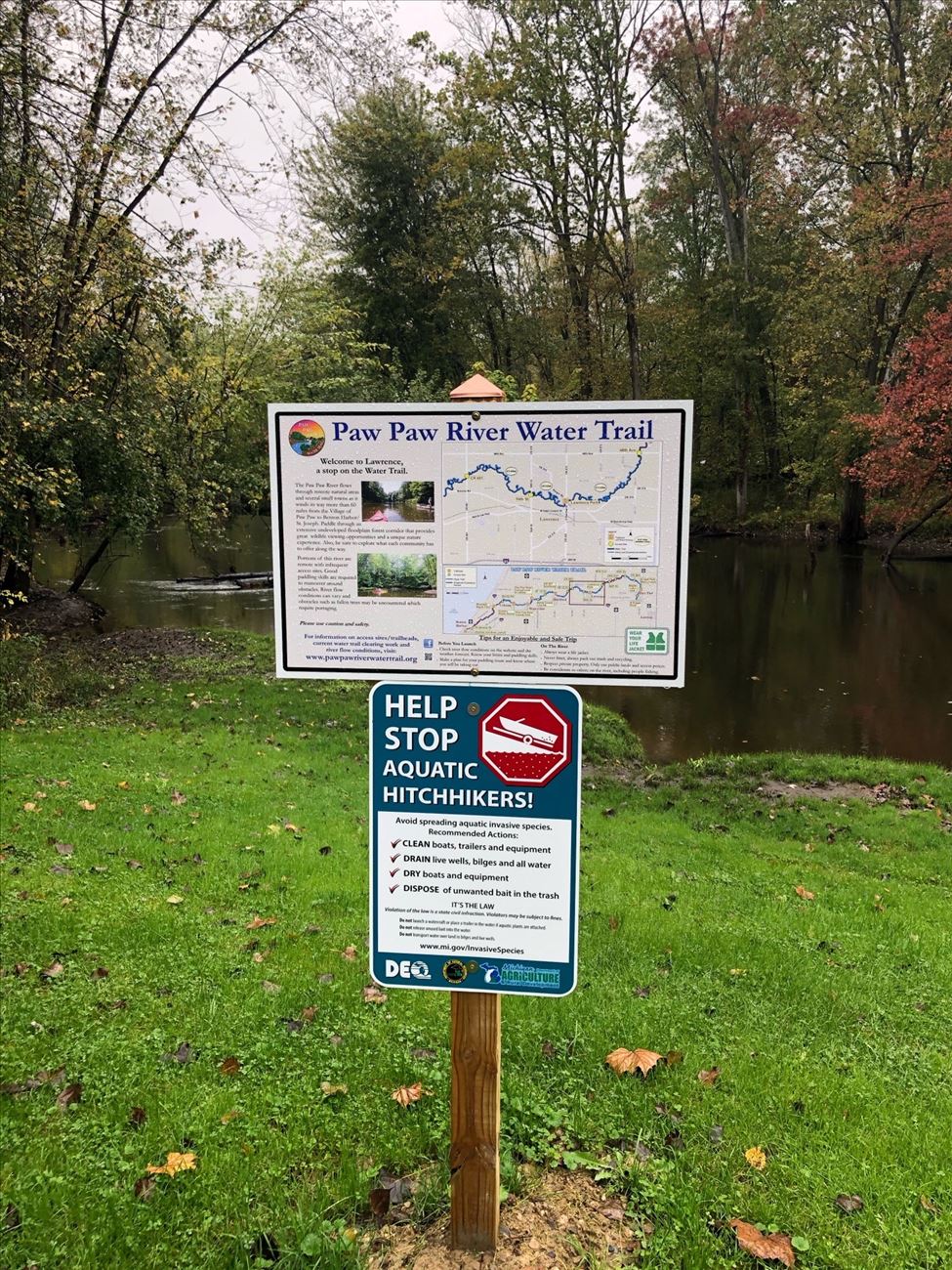 To find this access, go north through Lawrence on St. Joseph Street and continue straight through traffic light. This road is also called CR 215/CR 673. Just before the bridge, there is a park on the left (west) side of road and this is where the access is. Once again in the summer of 2021, the village of Lawrence has placed a portable toilet at this access site.