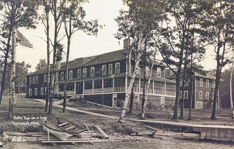 Topinabee was a planned resort community. H H Pike platted the area, and became the proprietor of Pikes Hotel, later named Hotel Topinabee. There was also a Pikes Tavern and Dancing Pavilion; in 1917 it was called Pikes Summer Tavern. Mr. Pike was involved with the distributing of Sanitas Springs water, in fact, Pikes Summer Resort and Sanitas Springs had the same letterhead. The water was marketed as both water and medicine, and was used exclusively on the Niagara portion of the MCRR.