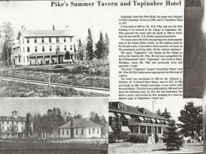 Pikes Hotel, later named Hotel Topinabee. There was also a Pikes Tavern and Dancing Pavilion, in 1917 it was called Pikes Summer Tavern. Mr. Pike was involved with the distributing of Sanitas Springs water, in fact, Pikes Summer Resort and Sanitas Springs had the same letterhead. The water was marketed as both water and medicine, and was used exclusively on the Niagara portion of the MCRR.