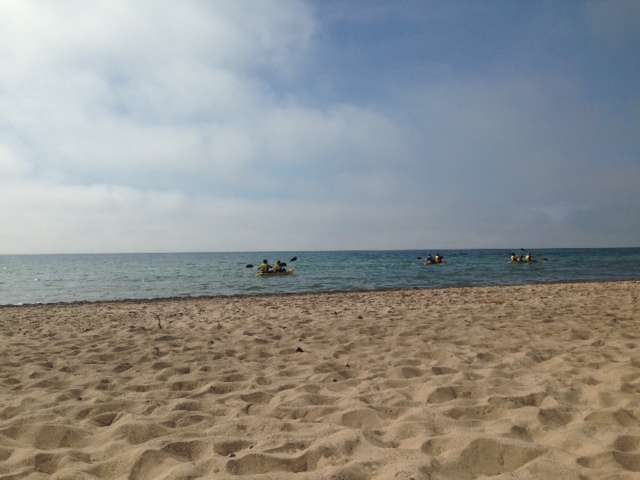 Large parking area [fee or Michigan recreational passport]. Carry approximately 300 feet across beach to lake [either north or south of bouys during swimming season]. Nearby are famous large sand dunes and hiking trails.