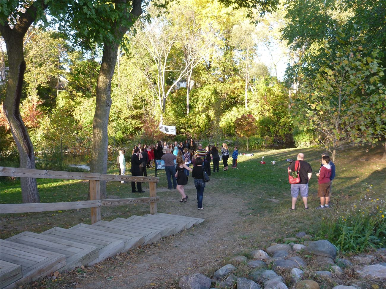 Wooden steps to riverbank area then some rocks in water at launch.