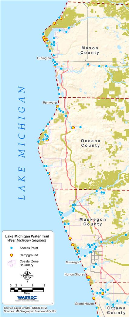 The West Michigan Water Trail extends from the Lake Michigan Recreation Area north of Ludington (Mason County) to Buchanan Park south of Grand Haven (Ottawa County). The water trail lies within portions of Mason, Oceana, Muskegon, Kent and Ottawa counties. West Michigan's 90-mile stretch of Lake Michigan coastline features popular swimming beaches and large sand dunes, forests, wetlands, lakes and streams. Lake Michigan provides access to 12 major river systems, scenic lakes, harbors, natural areas, working waterfronts, and federally designated wild and scenic rivers. The Grand River (Michigan’s longest) and the Muskegon River (Michigan’s second longest) enter Lake Michigan through West Michigan.